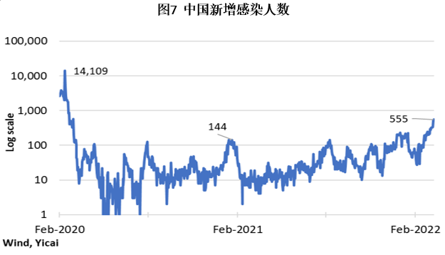 今年经济面临的第三个风险来自于疫情的变化。3月10日,中国新增感染病例达到555例,为两年来的最高水平(图7)。全国各地都有针对性地封锁社区。我四年级的女儿班上有42个孩子,其中有11个无法来上学。虽然他们可能与感染者有过密切接触,但没有人被感染。整个学校的学生都须接受新冠病毒检测。