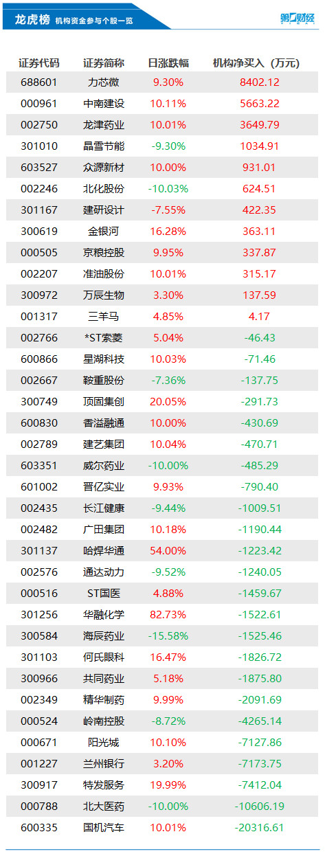 3月22日龙虎榜中,共36只个股出现了机构的身影,有12只股票呈现机构净买入,24只股票呈现机构净卖出。当天机构净买入前三的股票分别是力芯微、中南建设、龙津药业。当天机构净卖出前三的股票分别是国机汽车、北大医药、特发服务。