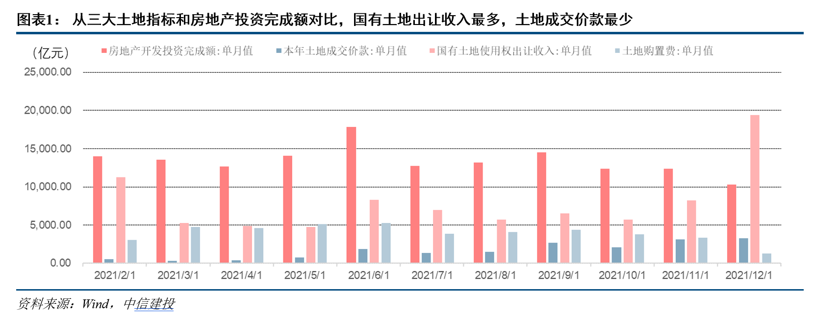 1-2月的房地产投资增速超预期,同比录得3.7%,而其中的土地购置费作为滞后指标录得11.3%,成为跨年支撑地产投资增速的关键因素。然而从1-2月的另外两个土地指标看,目前的土地市场和房地产市场依然不容乐观。根据财政部和统计局公布的数据,1-2月的国有土地出让收入和土地成交价款同比增速分别录得-29.5%和-26.7%。为什么三个土地相关指标出现如此大的差别?目前的土地指标对于房地产投资和土地市场意味着什么?