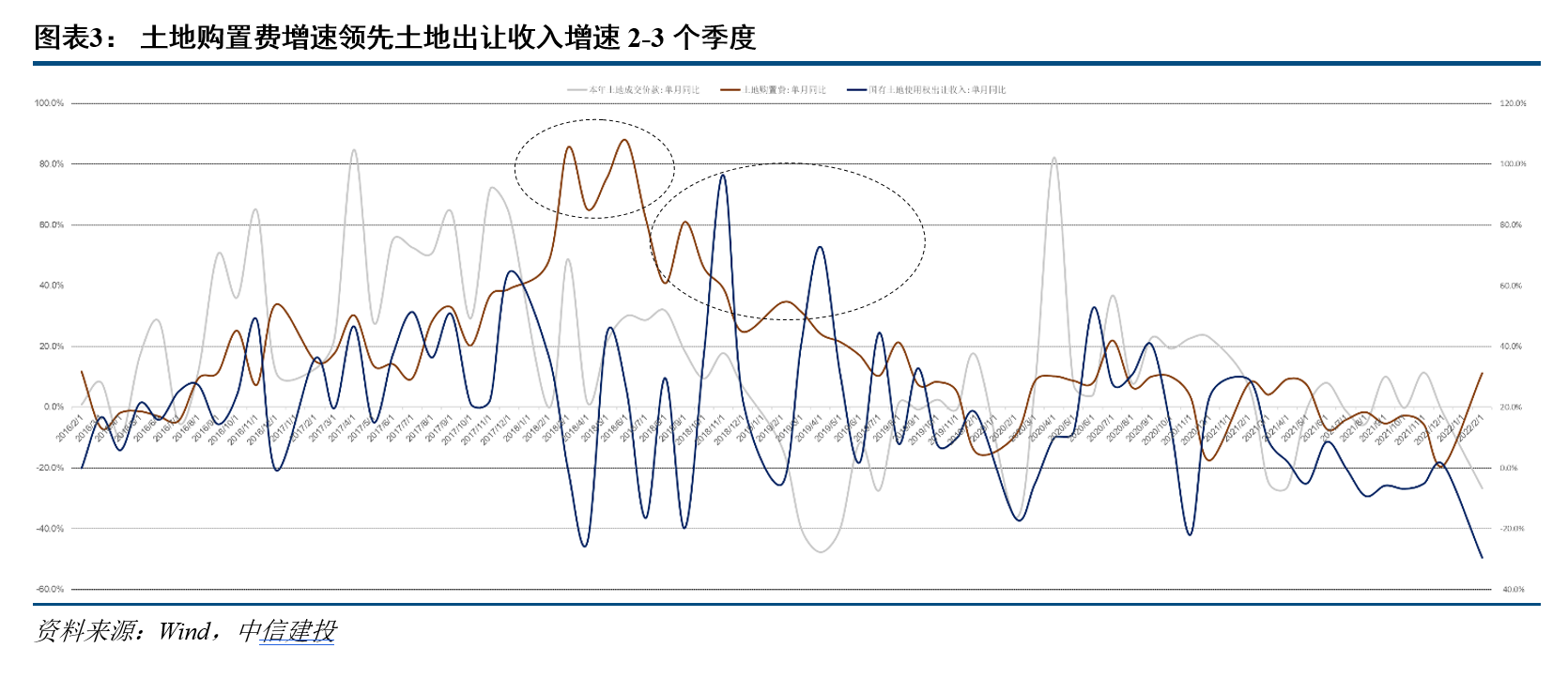 回顾过去近20年的数据变化,我们可以发现三项指标之间存在着较为明显的时滞周期。如图表2所示,土地成交价款和土地成交价款的趋势拟合程度很好,而以2010年为分野,两个指标之间的时滞出现了分化。在2010年之前,土地购置费和土地成交价款的累计同比增速之间基本没有时滞,我们认为,在那个时期,房地产投资开发投资处于黄金时期,房地产投资增速常年维持在两位数,投资的资金配套和项目推进效率极高,项目推进中土地购置费指标和当年土地成交一一对应,贴合紧密。而随着2010年34号文出台,调整了土地分期缴款方式,10-15年期间两个指标之间的滞后效应越发明显。15年之后房地产投资增速不断下行,房地产行业高速运转的引擎开始放缓,实际土地成交和项目推进之间开始出现时滞,目前土地成交价款增速领先土地购置费增速约3个季度左右。
