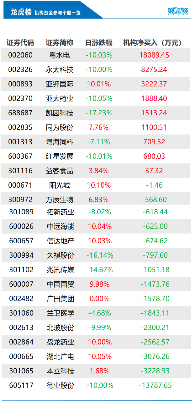 3月28日龙虎榜中,共24只个股出现了机构的身影,有9只股票呈现机构净买入,15只股票呈现机构净卖出。机构净买入前三的股票分别是粤水电、永太科技、亚钾国际。机构净卖出前三的股票分别是德业股份、本立科技、湖北广电。