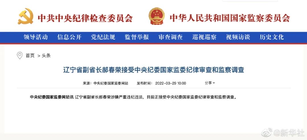 辽宁省副省长郝春荣涉嫌严重违纪违法,目前正接受中央纪委国家监委纪律审查和监察调查。