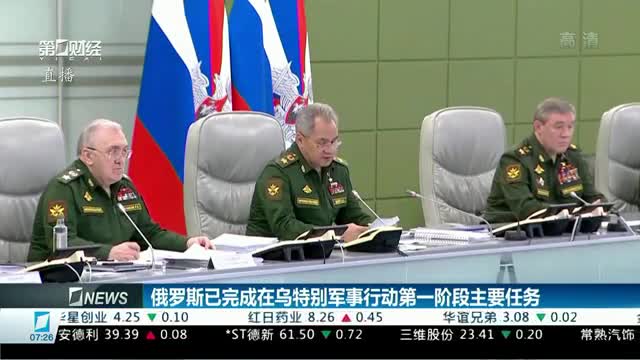 俄罗斯国防部长绍伊古29号在莫斯科出席相关工作会议时表示,俄方已完成在乌克兰的特别军事行动第一阶段主要任务,他同时指出,西方向乌克兰提供致命武器是不负责任的。绍伊古还表示,过去一个多月,乌军损失重大,空军和防空系统几乎瘫痪,俄武装力量将继续特别军事行动直至完成既定目标。