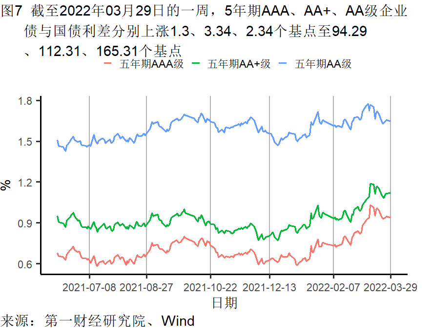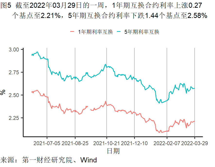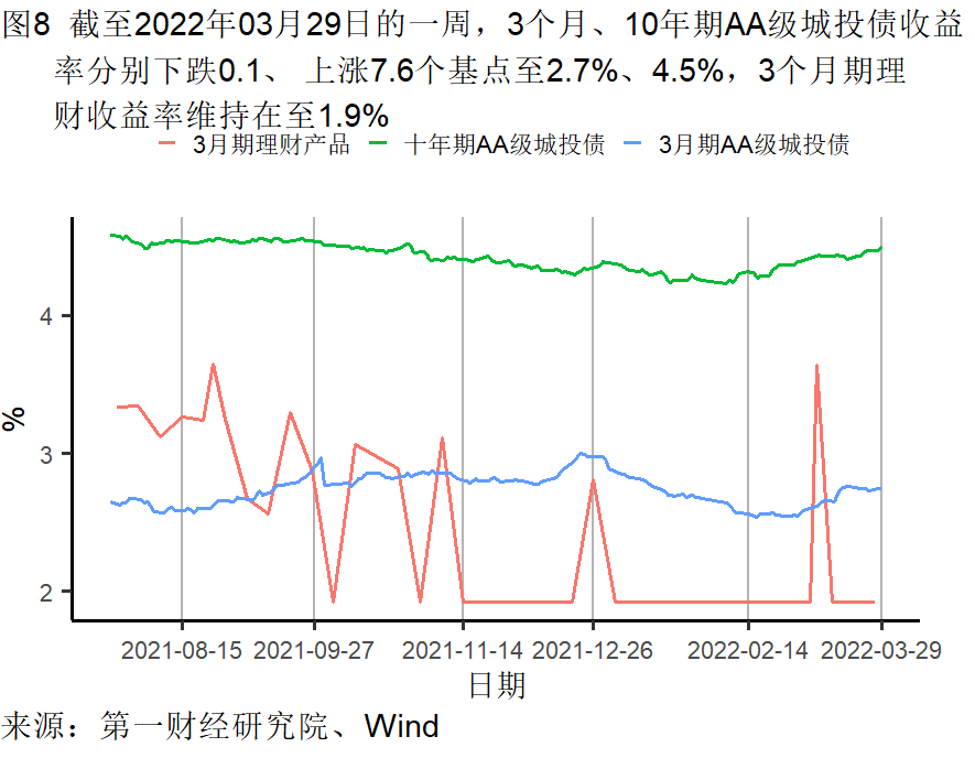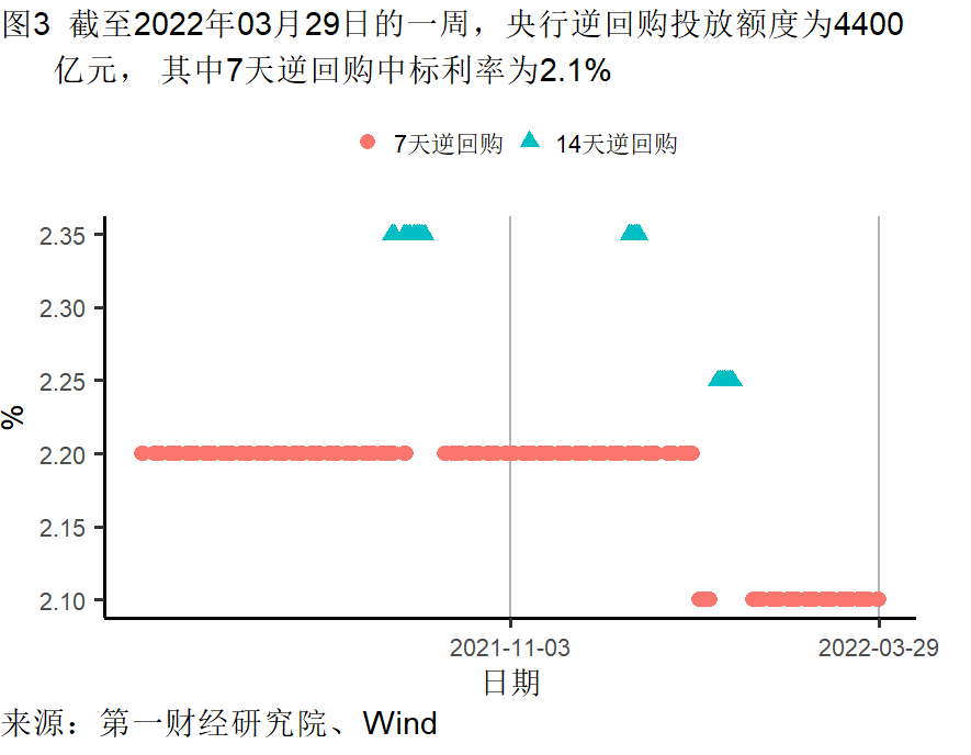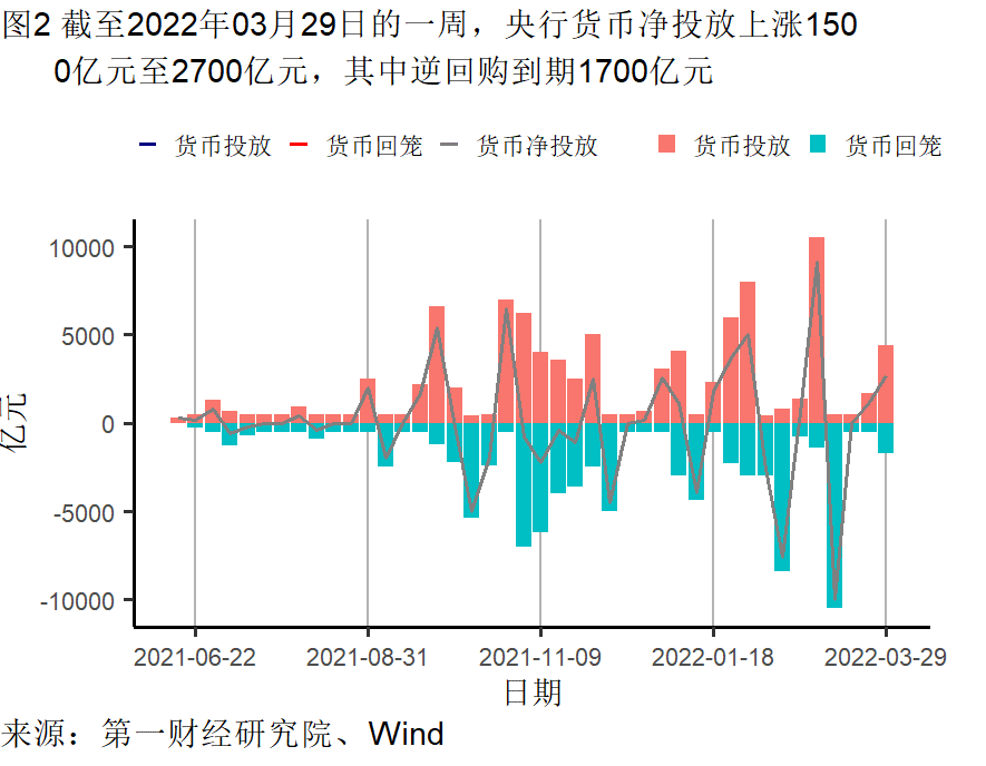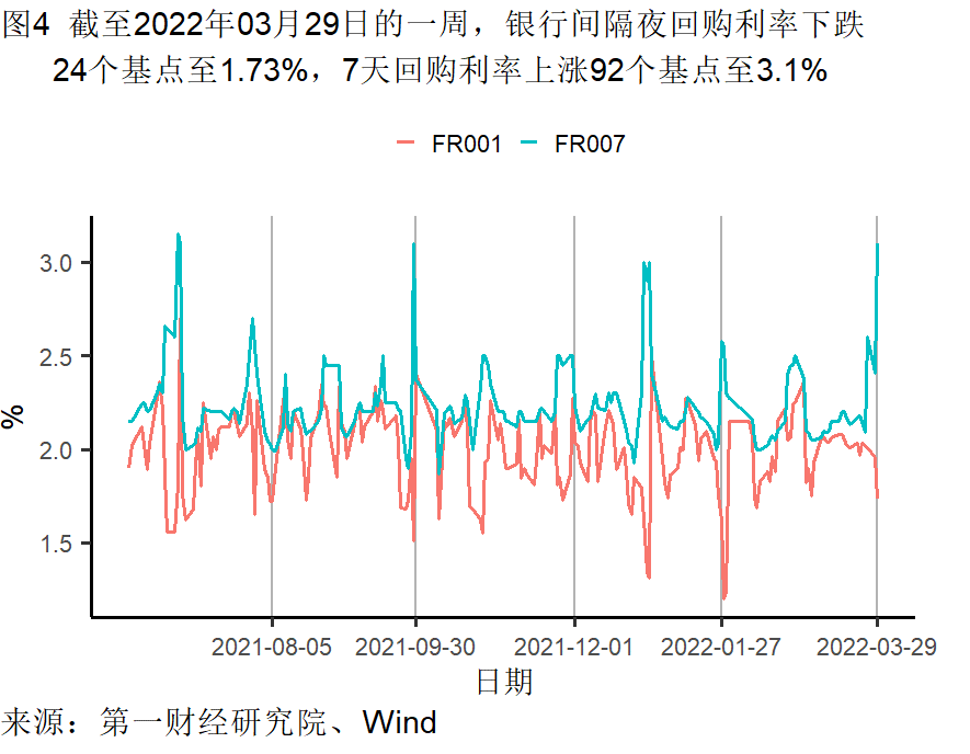 截至3月29日的一周,央行通过公开市场净投放资金为2700亿元。银行间隔夜利率在截至3月29日的一周下跌24个基点,过去一个月来下跌63个基点,较去年同期下跌9个基点。七天回购利率过去一周上涨92个基点,过去一个月来上涨72个基点,较去年同期上涨70个基点。