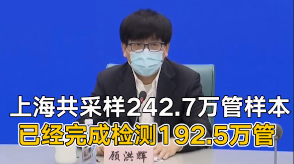 在4月5日举行的上海市疫情防控工作新闻发布会上,上海市政府副秘书长、上海市疫情防控工作领导小组办公室主任顾洪辉介绍了昨日全市核酸检测的进展情况。到今天4月5日8点,全市共采样2566.5万人,242.7万管样本,已经完成检测192.5万管,其余样本还在检测当中。