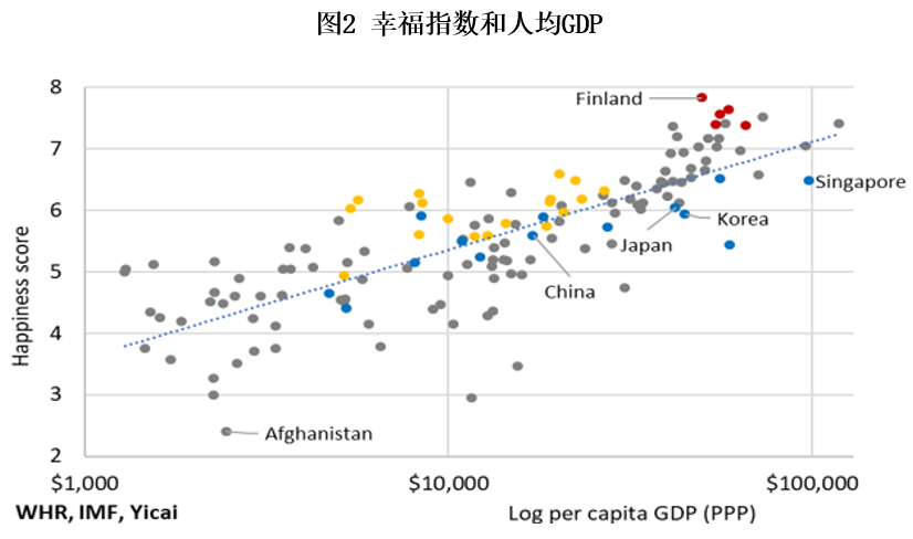 人均GDP和幸福感之间显然存在着很强的正相关关系。然而,这种关系并非线性(请注意,我们在图2的横轴上绘制的是人均GDP的对数)。人均GDP每增加1000美元,各个国家的幸福感增长就会越低。事实上,跨国数据表明,收入翻倍才能换来幸福指数增加0.5。