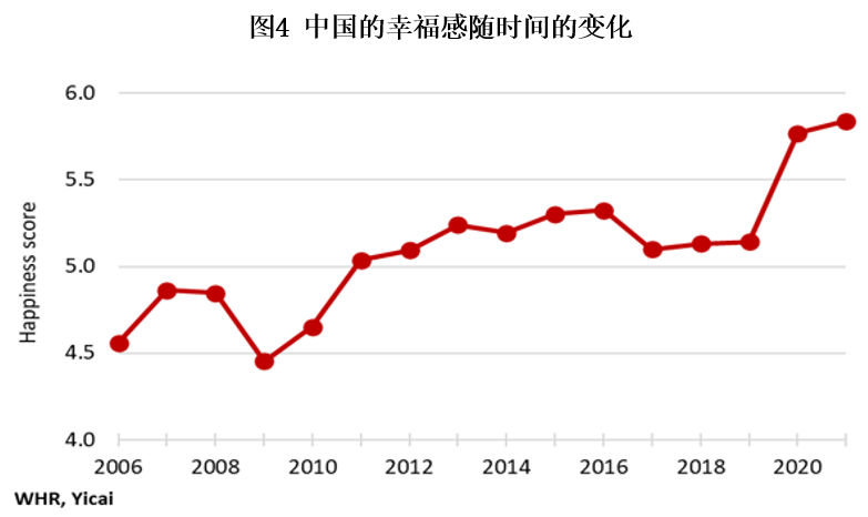 盖洛普对中国的评分显示,随着时间的推移,幸福感从2006-2009年的均值4.7%上升到2019-2021年的5.5%(图4)。