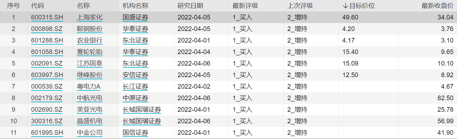 Wind数据显示,机构近五日调高11只个股评级,其中上海家化获国盛证券“买入”评级,目标价49.6元;鞍钢股份获华泰证券“买入”评级,目标价4.2元;农业银行获东北证券“买入”评级,目标价4.17元。此外,粤电力A、中航光电、中金公司等均获机构看好。