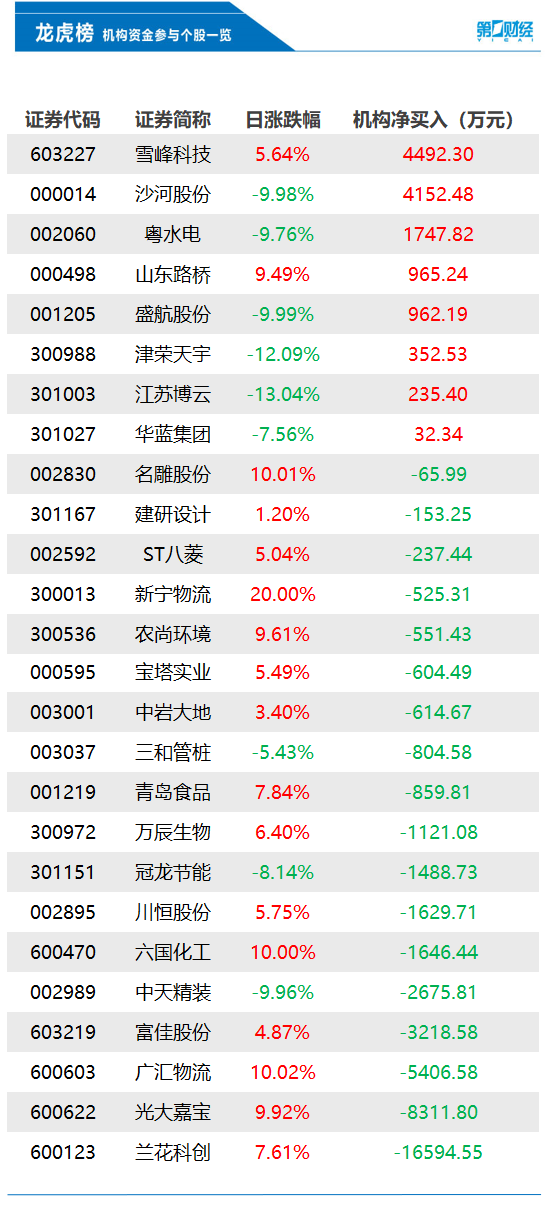 4月11日龙虎榜中,共26只个股出现了机构的身影,有8只股票呈现机构净买入,18只股票呈现机构净卖出。机构净买入前三的股票分别是雪峰科技 、沙河股份、粤水电。机构净卖出前三的股票分别是兰花科创、光大嘉宝、广汇物流。
