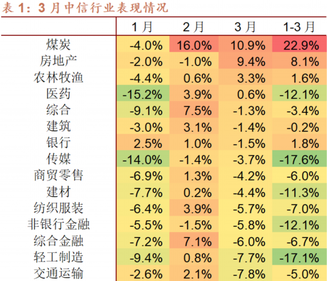 3月表现最好的行业是煤炭,上涨10.9%,其次是房地产,上涨9.4%,还有农业和医药在3月获得绝对收益。受油价上涨的影响以及国内双碳政策的纠偏,今年煤炭行业的相对收益极为明显。3月以来郑州、哈尔滨、福州以及兰州等省会城市放松商品房限购限贷措施提振房地产行业的表现。
