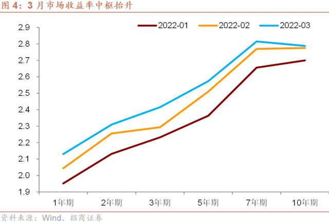 3月收益率曲线的中枢继续提升,但是长端利率上行幅度明显收窄。一方面,高频数据显示稳增长所受冲击低于市场预期,钢铁、水泥等价格数据仍在改善;另一方面,国内疫情过于严峻的形势使得市场普遍认为短期经济大幅调整的可能性较高。再者,外资撤离国内债券市场导致3年期国债收益率在3月上行幅度明显超过其他期限的国债收益率。各种因素,3月1年期国债收益率上行9bp,3年期上行12bp,而10年期仅上行1bp。