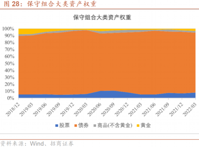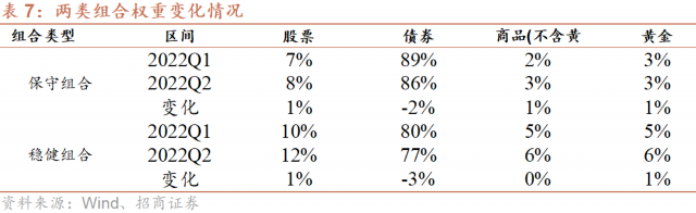针对2022Q2的配置建议,保守组合的大类资产配置权重建议为股票:债券:商品(不含贵金属):黄金=8%:86%:3%:3%,稳健组合的大类资产配置权重建议为股票:债券:商品(不含贵金属):黄金=12%:77%:6%:6%,相对上季度,主要下调了债券资产的配置权重,同时小幅上调权益和商品资产的配置比例。