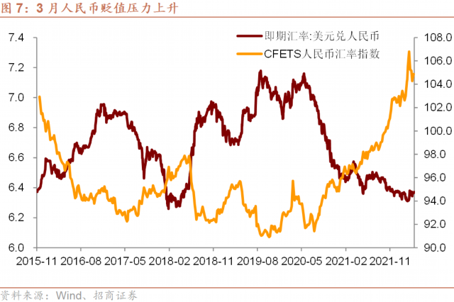 3月人民币汇率触顶回落。美联储3月加息25bp,中美利差加速收窄,人民币汇率贬值压力上升。其中美元兑人民币汇率贬值0.51%至6.3433,人民币汇率指数略微贬值0.01%至104.40。3月美元指数升值1.93%,人民币汇率贬值幅度明显小于美元升值,这说明相较于其他非美货币,人民币的强势货币地位并未改变。