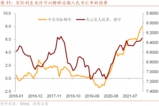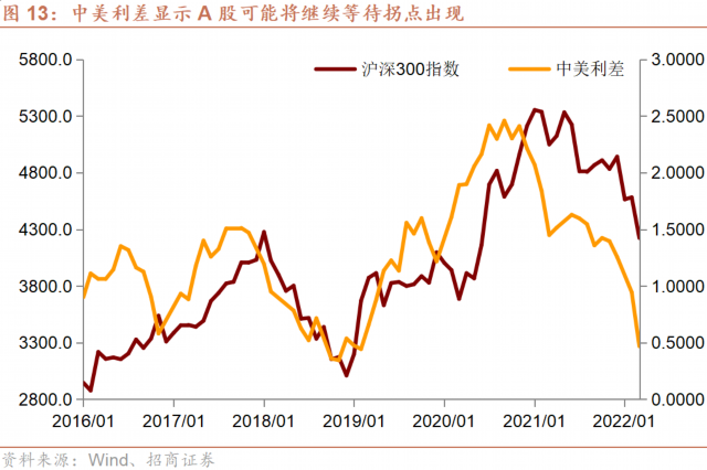 对于A股市场而言,811汇改以来,中美利差走势与沪深300指数的相关性明显提高,而且中美利差是沪深300指数的领先指标。本轮中美利差于2020年9月触顶,随着震荡下行,今年以来加速收窄。对应于A股市场,沪深300指数于2022年1月触顶,滞后一个季度左右。目前看,中美利差重新走扩的主要动力可能来源于国内经济形势的改善,这意味着上半年中美利差可能不会在上半年重新走扩。那么,从中美利差的角度看,A股上半年难有指数上的机会,当前仍是低位震荡的阶段,下半年A股重拾升势的可能性更高。