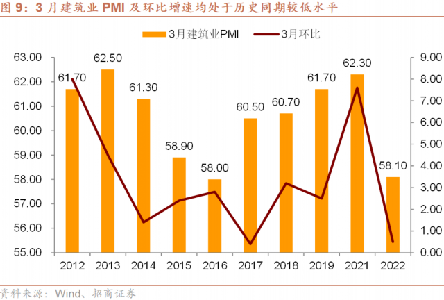 非制造业PMI显示基建投资需求的扩张速度低于预期。3月建筑业PMI为58.1%,环比上涨0.5%。这两组数据在过去十年中均处于最低水平附近。建筑业PMI仅比2016年同期高0.1个百分点,环比增速仅为2017年同期高0.1个百分点。但2016年3月环比增速明显快于今年,而2017年建筑业PMI则处于60%以上的高景气状态,其扩张速度业明显快于今年。3月高频数据所反映的情况与PMI数据相吻合,可以合理推测,3月传统基建投资和房地产投资增速都将出现较大幅度的回落。