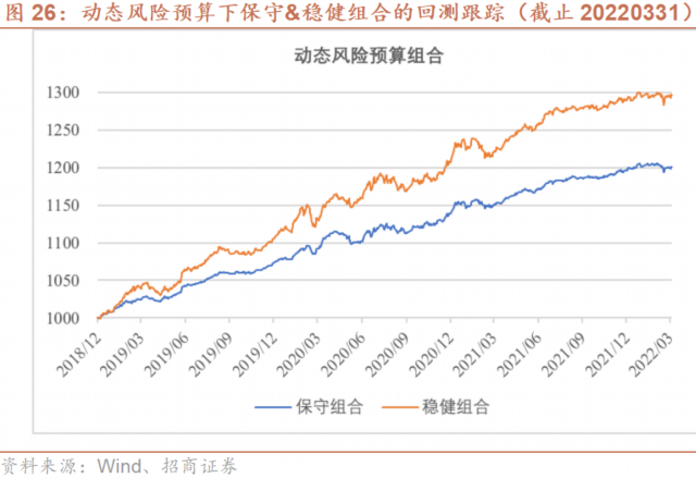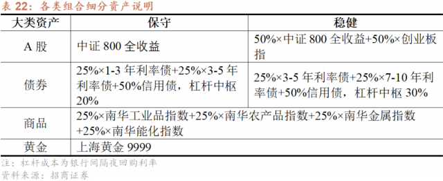 第二,细分资产的筛选与配置结构。保守组合中,权益资产以中证800指数为基准,市场风格偏向大盘均衡,固收资产的结构为50%×利率债(3年久期)+50%×信用债。稳健组合中,权益资产以50%×中证800+50%×创业板指为基准,市场风格更为均衡,固收资产的结构为50%×利率债(5年以上久期)+50%×信用债。结合组合的风险偏好,我们在细分资产的筛选和配置结构上进行了匹配调整。