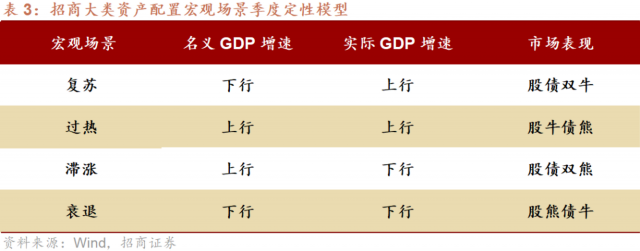 在季度大类资产配置的展望中,宏观定性分析的指标我们主要观察名义和实际GDP增速的走势。从历史数据看,由名义GDP和实际GDP构成了四种宏观场景:衰退(名义和实际GDP增速同时下行)、复苏(名义GDP增速下行而实际GDP增速上行)、过热(名义和实际GDP增速同时上行)以及滞涨(名义GDP增速上行而实际GDP增速下行),相应所对应的股债资产四种走势组合:债牛股熊、股债双牛、股牛债熊以及股债双熊。