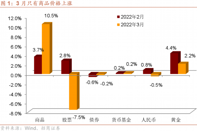 3月国内市场股债双杀,万得全A指数下跌7.5%,中债净价总指数下跌0.2%,美元兑人民币贬值0.5%,但南华综合指数上涨10.5%,上期所黄金价格上涨2.2%。资产价格表现倒推的3月宏观经济场景是滞涨。尽管3月经济数据尚未公布,但疫情冲击下3月基本面数据“滞”的风险非常高,3月CPI和PPI同比均超预期,也确实存在“涨”的因素。在此背景下,3月市场确实只有利于商品价格上涨。
