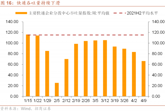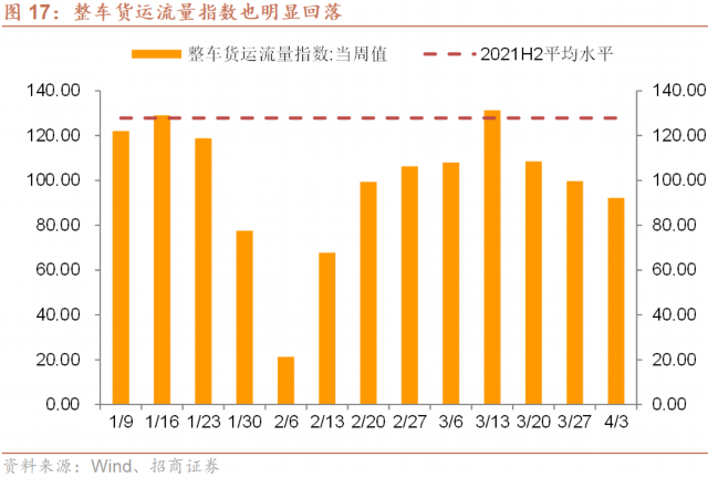 受到本轮疫情冲击较为严重的领域是物流领域。4月第1周,主要快递企业分拨中心吞吐量指数跌至66.42,比深圳封城前下滑37%,仅高于今年春节时的水平。3月最后1周,整车货运流量指数为92.2%,比节后高点下滑29.8%。其中上海为49.52,吉林为17.53。人员流动也受到极大的影响,上周九大城市地铁客运量为1.8亿人,比去年同期下滑45.2%,比今年节后高点下滑40.3%。这些情况在3月制造业PMI数据上也有对应,3月生产指数环比下滑0.9%,但由于物流的问题,积压订单指数逆季节性环比回升0.9%,采购量环比下降2.2%,供货商配送时间指数环比下降1.7%。