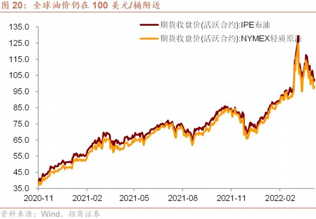 第二,全球通胀交易主线。从目前的情况,全球涨价压力的并未消除,终端消费国需求景气、商品和制成品供给不足以及地缘政治风险依然存在。拜登政府上台后,美国重返《巴黎协定》,当前美国原油产量仍低于疫情前的水平,且能源投资由于民主党对清洁能源的支持而持续低迷。在美国原油产量仍有缺口的前提下,OPEC+国家增产意愿较弱。全球原油市场仍处于供需失衡状态。原油价格持续高位运行将带动其他商品价格的上涨。俄罗斯是全球重要的能源、粮食及部分有色金属的出口国。俄乌冲突导致俄罗斯相关商品出口受到严厉制裁,在预期的自我实现下,一部分商品价格的上涨幅度已经完全脱离了基本面的支持,甚至导致投机需求的旺盛。对应到A股市场,上游资源品行业,如煤炭、石油石化依然有投资价值。
