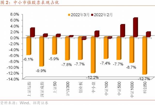 3月A股普跌,大盘、小盘、成长、价值跌幅多与少的区别,相对而言,大盘好于小盘,中证100跌幅小于中证500、1000;价值好于成长,上证50跌幅小于创业板指。