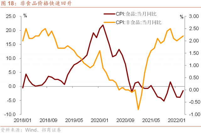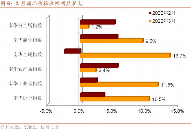 3月商品价格加速扩张。疫情因素并未阻止商品价格的强势,南华综合指数上涨10.5%,涨幅比上月扩大6.8个百分点。本月金属指数涨幅达到13.7%,工业品指数达到11.8%,涨幅均比2月显著扩大。受美联储加息的影响,3月贵金属指数涨幅收窄至1.2%。商品价格的强势一则国内部分生产因疫情受限,二则非疫情地区稳增长正有序开展,需求回落幅度其实低于预期。