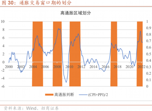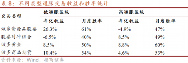 我们将(CPI+PPI)/2构建综合的通胀指标观察参考,并将历史上通胀水平高于3%的时间区间划分为通胀交易窗口期,并统计上述四种通胀交易模式,在窗口期中的年化收益和胜率情况。从统计结果来看,构建股票对冲组合或做多黄金的交易模式,均能较好的获得绝对收益,历史上通胀交易窗口期的年化收益达到8%以上。
