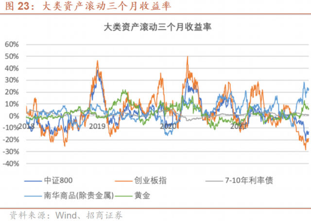 波动率层面,商品资产的波动率小幅下滑后再度走高,当前波动率依然处于历史高位,同时伴随权益市场的下跌回调,中证800、创业板指等指数的波动率也显著走高,尤其值得注意的是创业板指的波动率从年初的不足20%快速攀升至30%以上,各类资产波动率的提升对组合的回撤管理带来挑战;