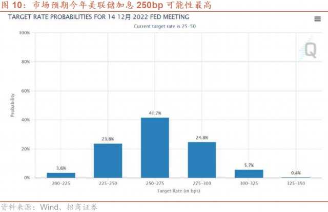 本轮超预期的疫情形势将催生更多稳增长措施的出台,今年经济所面临的下行压力以及前所未有的就业压力并不会因疫情的反弹而减轻。3月30日召开的国务院常务会议明确要求 “制定应对可能遇到更大不确定性的预案”。国内基本面的恶化推动国内政策环境的进一步宽松,而美联储今年可能还将加息6次,以鲍威尔近期的表态看,上半年可能还将加息100bp。而市场预期数据显示,今年美联储加息250bp概率达到41.7%,远远高于利率点阵图所显示的加息200bp的概率。内松外紧的政策环境将会出现更加极致的演绎。