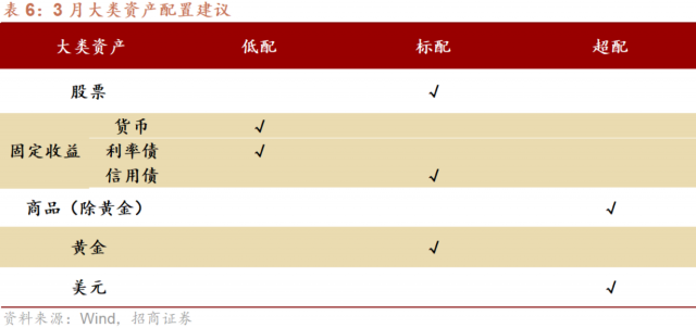 基于我们对增长、价格以及政策的判断,从节奏上看,2季度A股可能先跌后涨,而债券价格的节奏可能是先跌后涨。因此,2季度应逐步增加权益资产配置比例,而逐步降低债券资产的规模。商品的投资机会将贯穿整个2季度,黄金价格可能将随着美联储更快速的收紧而结束当前的强势,而人民币汇率在2季度走弱的可能性更高。综上,2季度的配置建议如下: