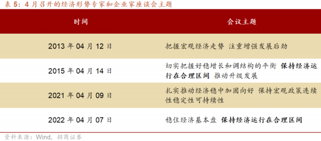 另外,总理主持的经济形势专家和企业家座谈会在4月召开也不多见。过去十年,类似的座谈会一般于1月、7月和11月召开。对应的事项一般是征询政府工作报告撰写意见、年中经济复盘及下半年展望以及为征询中央经济工作会议和次年经济工作的意见和建议。截至目前,座谈会已经召开了32次,仅在2013年、2015年、去年和今年的4月额外召开了一次经济形势专家和企业座谈会。这4次额外召开的座谈会往往对应着当时经济形势的复杂和不确定性高的问题。例如,2013年起,季度GDP增速持续低于8.0%,2015年季度GDP增速已经回落至7.0%附近,2021年则是由于基数扰动下,准确把握上半年经济难度较大,而今年毫无疑问是由于疫情冲击。从会议主题也能看出4月座谈会对“保持经济运行在合理区间”比较关注,这说明经济面临下行压力可能是4月召开座谈会重要驱动因素之一。