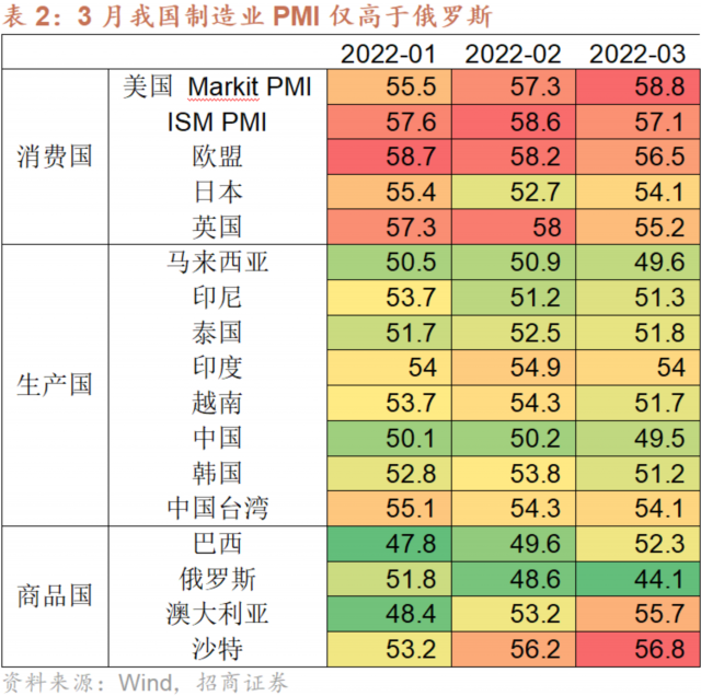 横向比,3月我国制造业PMI也处于偏低水平。美国Marikit PMI环比上升1.2%至58.5%,欧洲国家制造业PMI虽然环比下滑,但仍位于临界值以上,其中欧盟制造业PMI为57%,英国为55.5%,均大幅领先于中国。