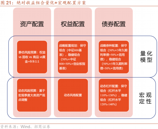 第三,债券杠杆的动态配置。保守组合中,债券资产的杠杆范围为10%-30%,稳健组合中,债券资产的杠杆范围为20%-40%,具体每季度基于宏观团队对流动性环境状态的判断,来确定最终的杠杆水平。