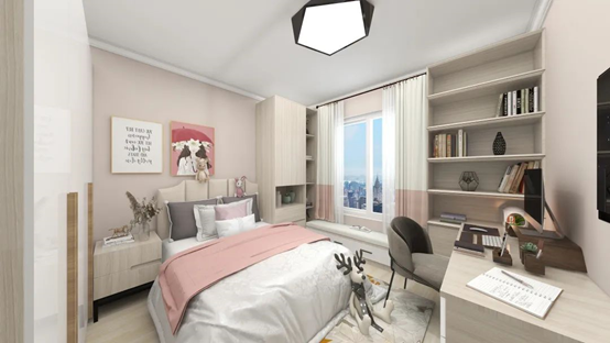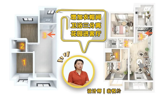 设计师基本上向右平移了卫生间,借用过道,将正方形拉长成长方形,做干湿分离;还次卧增加书房功能,既满足孙女居住需求,又可以阅读学习,两面墙的柜体,用来收纳杂物。