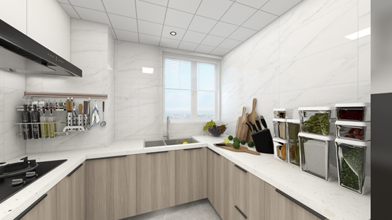鲁阿姨希望扩大厨房面积,设计师将原厨房门向两侧拉平,做成四扇折叠门,打开门,厨房增加2㎡使用空间。U型厨房的洗-切-炒黄金三角动线让下厨更便捷,操作台面扩容后,老两口可以一起烧饭了。