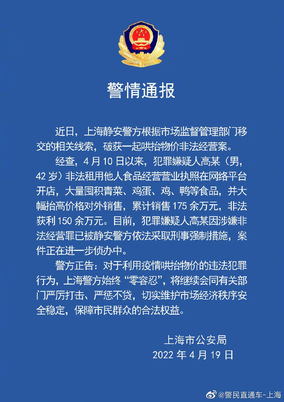 据@警民直通车-上海微博消息,上海市公安局4月19日发布警情通报称,近日,上海静安警方根据市场监督管理部门移交的相关线索,破获一起哄抬物价非法经营案。