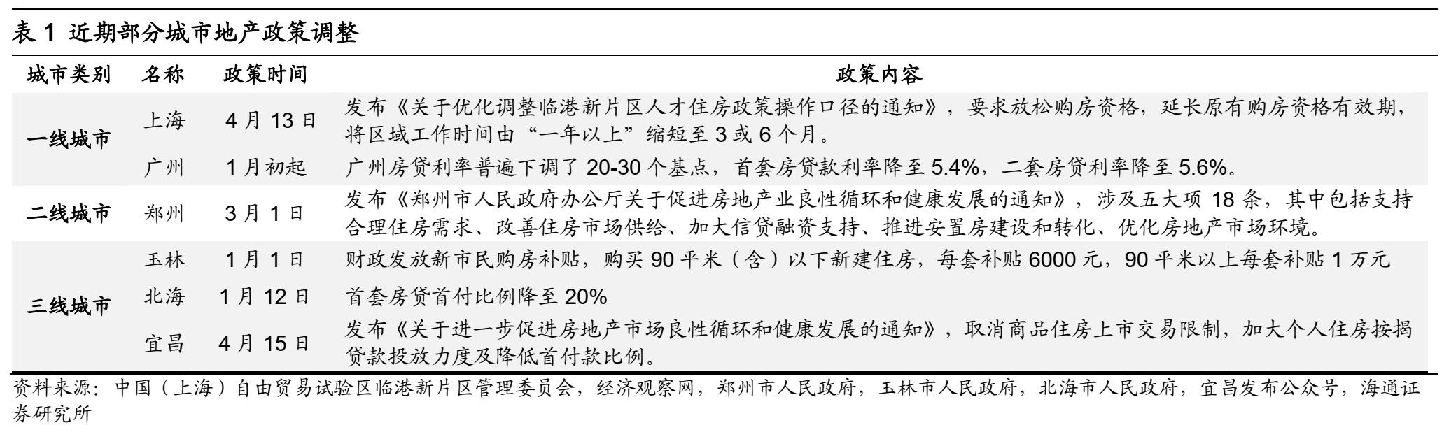 一线城市调整限购、下调房贷利率,信号意义显著。4月13日,上海临港新片区放松购房资格,延长原有购房资格有效期,将区域工作时间由“一年以上”缩短至3或6个月,其中3个月的人才住房政策重点支持单位达195家。1月以来,广州、深圳均不同程度下调房贷利率,广州房贷利率普遍下调了20-30个基点,首套房贷款利率降至5.4%,二套房贷利率降至5.6%。同时期北京下调房贷利率5个基点。
