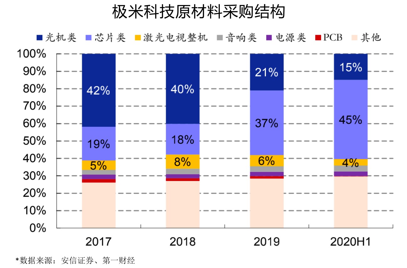 光机自研占比接近饱和叠加芯片供应紧张,短期看,极米后续通过成本端优化进一步提升盈利能力的效果可能有限。