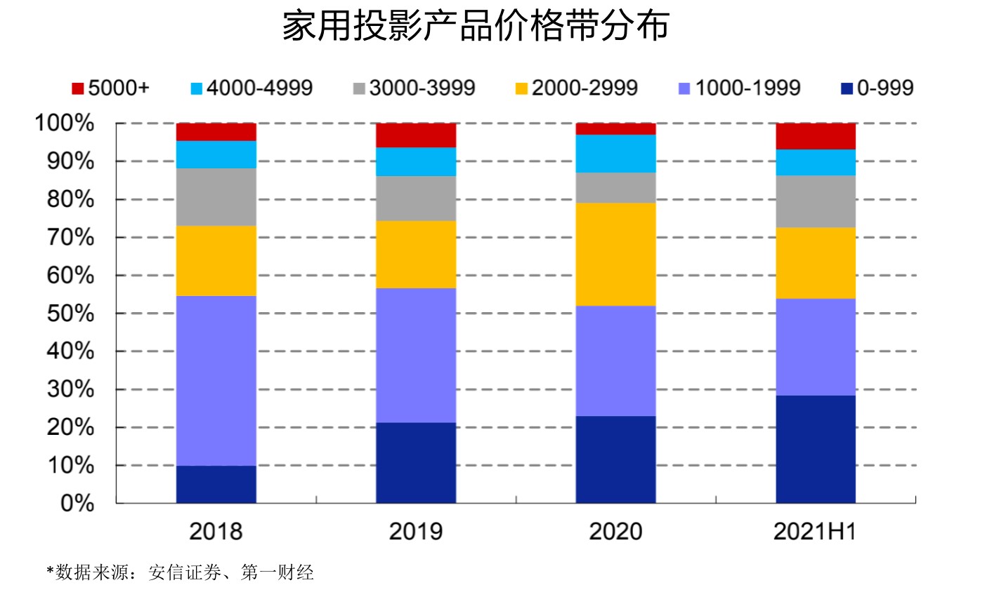 事实上,随着国内投影仪产业链不断完善,成本下降使得家用投影仪入门门槛降低,导致目前智能投影市场呈现千元以下产品占比持续提升、中端价位产品份额遭挤压、高端份额不降反增的局面。