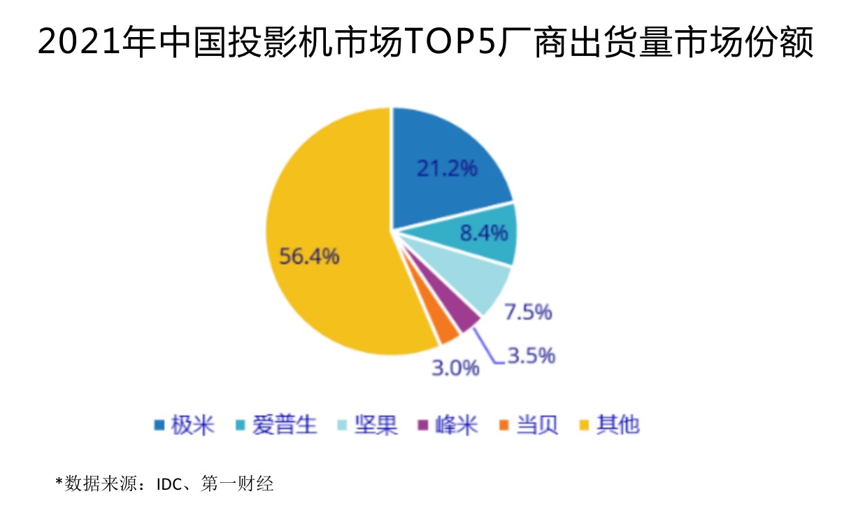 极米科技在中国投影设备市场已经连续4年出货量第一,2021年以21.2%的市占率领跑投影设备市场,出货量超过第二至四名总和。