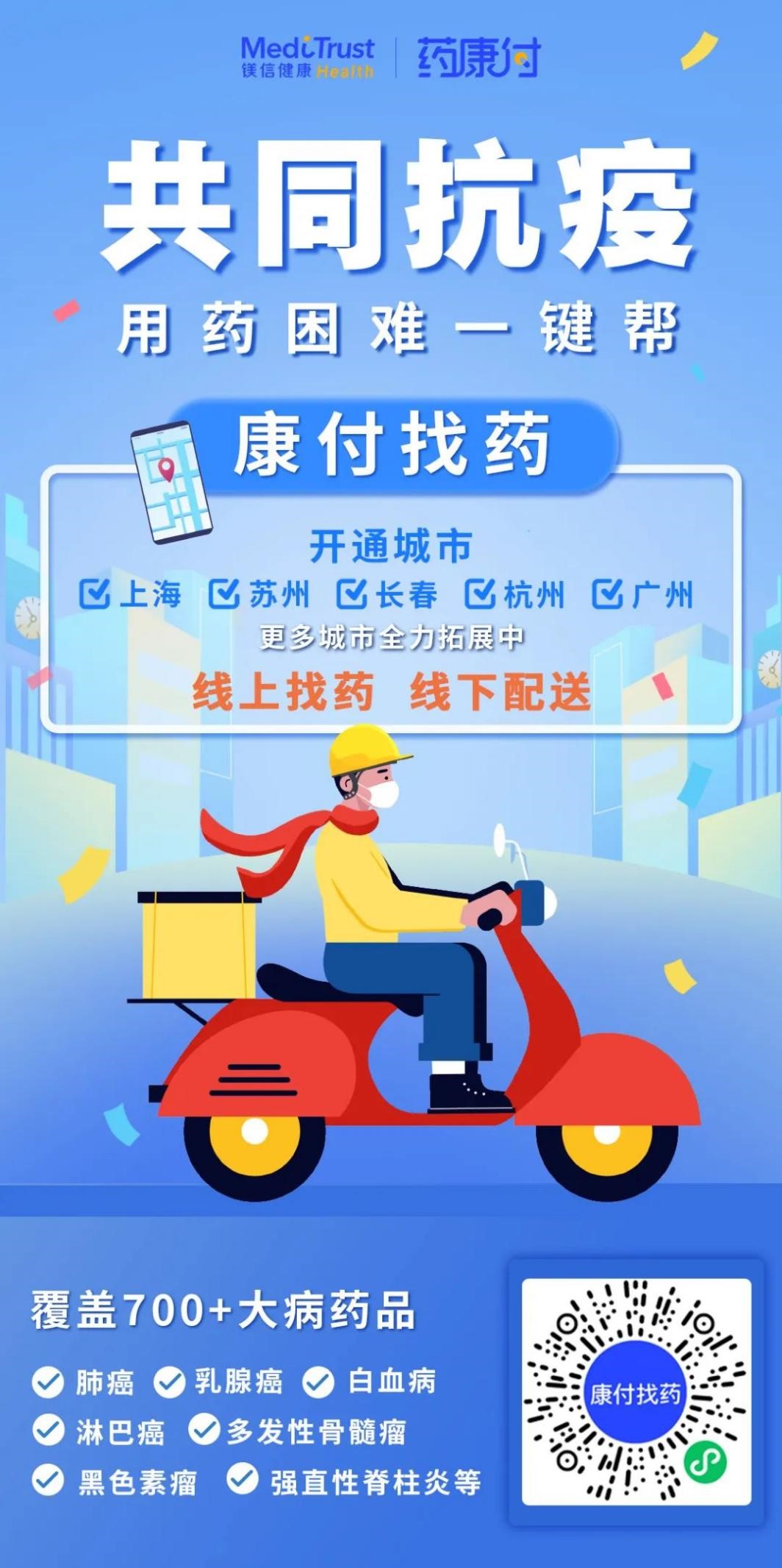 镁信健康"康付找药"始于上海,着眼于全国。如今镁信健康推出的“康付找药”专项服务已经正式走出上海,新增覆盖苏州、长春、杭州和广州等地,在更大的空间和渠道践行“人人有保障,全家享健康”的公司愿景。