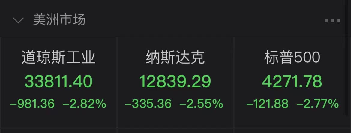 当地时间上周五,美股全线收跌。道指收跌2.82%,纳指跌2.55%,标普500指数跌2.77%。其中道指创下2020年10月底以来最大单日跌幅。