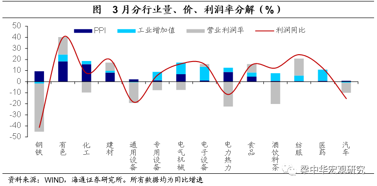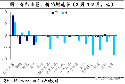 从分行业量价分解来看,除煤炭外的上游原材料价格下降,拖累上游行业利润,但钢铁、建材等行业产量有所增加,对利润又形成一定支撑,这或是由于国内基建投资前置,带动了基建相关材料的需求。