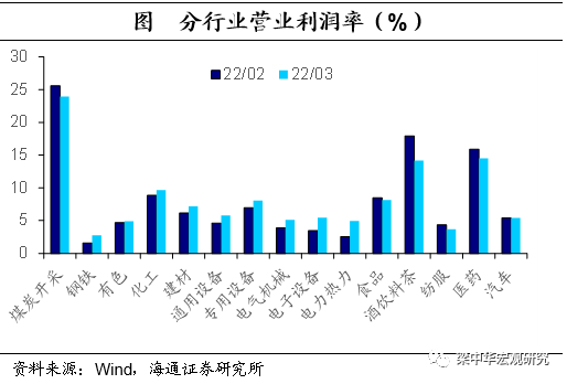 3月规上工业企业利润当月同比增长14.0%,较1-2月增速有明显提高。虽然受疫情影响,量价齐跌,但利润率的改善对利润增速形成支撑。其中,原材料价格有一定回落,使得中游利润率回升,且叠加稳基建下需求增加,使得相关行业的利润占比有所提高。下一阶段,企业利润主要取决于国内疫情的演变,4月国内疫情影响仍较显著,或对企业利润有一定压制,但后续稳增长政策或加大力度,基建、地产、消费政策将有望更积极调整,对相关行业或有利好。