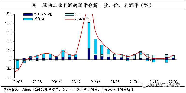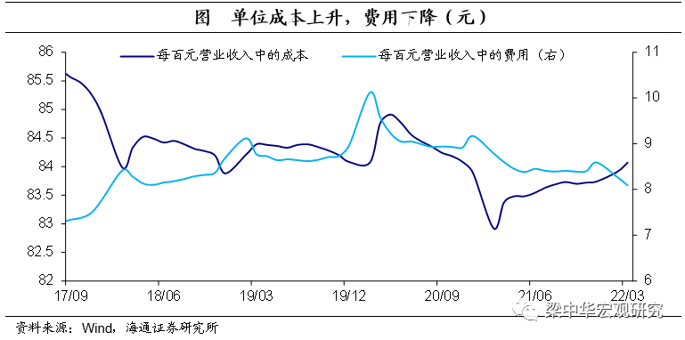 从量价分解看,利润率的回升是主要原因。一方面,量价对利润增速的贡献都有所减少,受3月国内疫情的影响,部分地区的工业生产有所停滞,3月全国规模以上工业增加值同比实际增长5.0%,较1-2月回落2.5个百分点,而在高基数影响下,3月PPI同比继续回落至8.3%。另一方面,减税降费颇有成效,虽然单位成本小幅上涨,但企业每百元营收中的费用降至8.09元,为2018年以来的最低,使得当月营收利润率大幅升至6.72%,对利润增速的贡献由负转正。