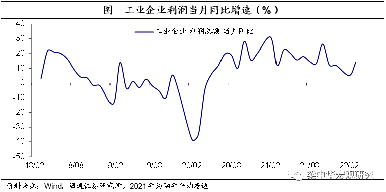 工业企业利润增速稳中有升。2022年一季度规上工业企业利润累计同比增长8.5%,较1-2月提高3个百分点,其中3月当月同比增长14.0%,为2021年11月以来的最高当月增速。
