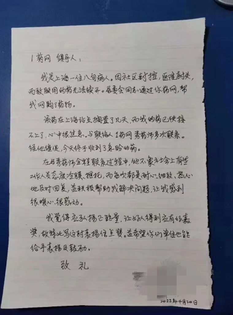 “我是上海一位八旬病人,因为社区封控等原因,我长期服用的药无法续开,居委会同志通过1药网帮我网购了药物......与联络药师多次联系后,今天终于收到了急盼的药......”4月20日,上海市医药保供企业1药网收到了这样一封感谢信。