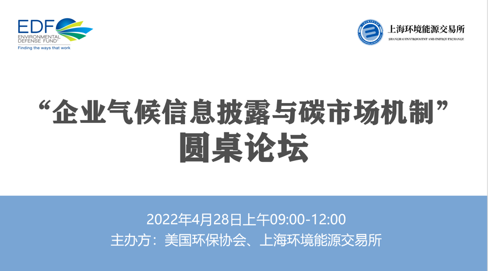 2022年4月28日上午,上海环境能源交易所(以下简称“上海环交所”)与美国环保协会(EDF)联合举办了“企业气候信息披露与碳市场机制”圆桌论坛。气候投融资专业委员会副秘书长、中节能生态产品发展研究中心有限公司总经理廖原,上海环交所董事长赖晓明,“一带一路”绿色发展国际研究院执行院长张建宇发表致辞,上海环交所总经理刘杰主持会议。