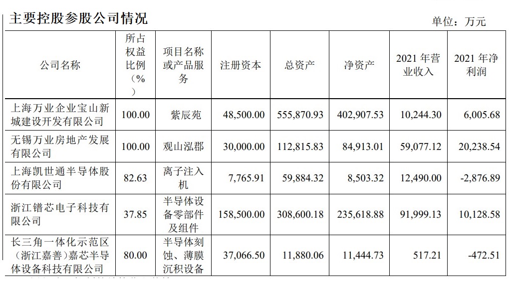 年报显示,万业企业旗下凯世通和嘉芯半导体主要从事集成电路核心装备业务。