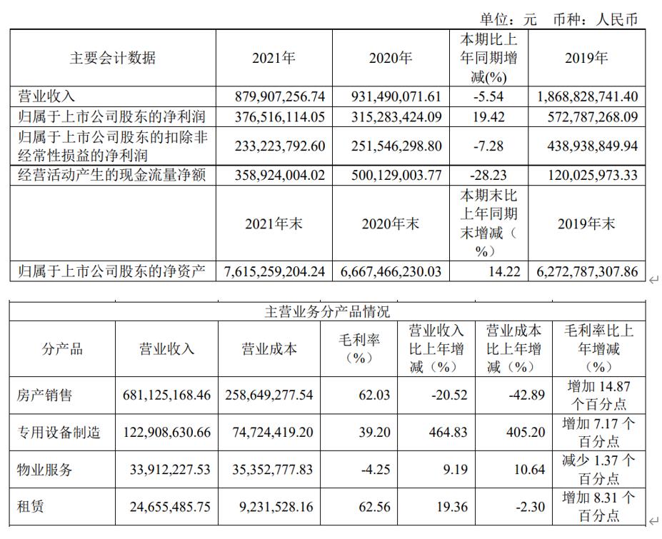 万业企业(600641.SH)4月29日晚间发布2021年年报,2021年,公司实现营业收入8.80亿元,同比下降5.54%;实现归母净利润3.77亿元,同比增长19.42%;实现扣非净利润2.33亿元,同比下降7.28%。分产品来看,公司专用设备制造业务2021年实现营收1.23亿元,同比大增465%,毛利率水平同比增加7.17个百分点。
